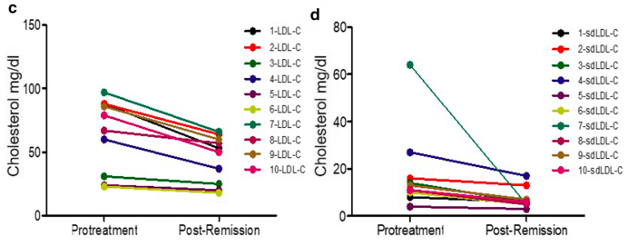 10ÀýT2DM»¼Õߣ¨ÄÐ6Àý£¬Å®4Àý£©ÖÎÁÆÇ°ºó¼ì²âLDL-C£¬sdLDL-CµÄˮƽ¡£Êý×Ö1µ½10´ú±í²¡ÈË1µ½10