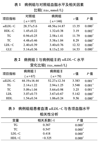 ÆëÆë¹þ¶ûҽѧԺÁ¥ÊôµÚÈýÒ½ÔºµÄÑîÐã¾²µÈ[6]£¬½«146ÀýT2DM»¼£¨ÆäÖÐÄÐ85Àý£¬Å®61Àý£»ÄêËê30¡«70Ë꣩Öд¿´âT2DM»¼Õß67ÀýΪ²¡Àý×é¢ñ£¬T2DM¼°²¢·¢Ö¢»¼Õß79ÀýΪ²¡Àý×é¢ò£»ÁíÑ¡ÔñͬÆÚ¿µ½¡Ìå¼ìÕß107Ãû×÷Ϊ±ÈÕÕ×é¡£Á½×é¾ù¾ÙÐÐsd LDL-C¡¢GLU¡¢TC¡¢TG¡¢LDL-C¡¢HDL-C¼ì²â¡£ÊÓ²ìT2DM¼°Æä²¢·¢Ö¢»¼ÕßѪÇåÖÐsdLDL-Cˮƽת±äÇéÐβ¢ÆÊÎöÆäÁÙ´²Ó¦ÓüÛÖµ¡£Ñо¿Ð§¹ûÅú×¢£¬sd LDL-CÔÚT2DM»¼ÕßÖÐÉý¸ßÏÔ×Å£¬sd LDL-CÓëTG¡¢TC¡¢LDL-C³ÊÕýÏà¹ØÓëHDL-C³Ê¸ºÏà¹Ø¡£ÊÓ²ìsd LDL-CµÄת±äÇéÐοÉÓÃÓÚÕ¹ÍûT2DM²¢·¢Ö¢²¡±ä±¬·¢Î£º¦¡£