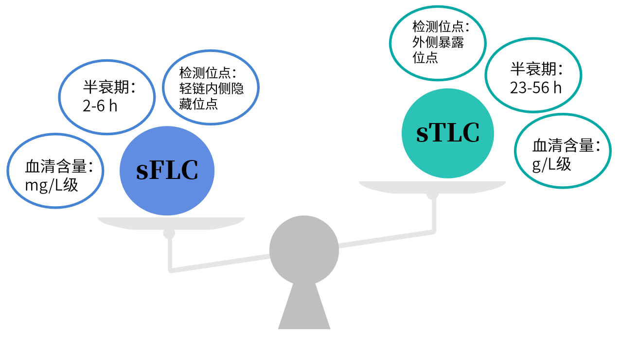 由于sFLC迅速度更高,半衰期更短,能越发实时地反应病情转变,为疾病的早期诊断提供更可靠的依据,近年来成为优于总轻链测定的标记物。