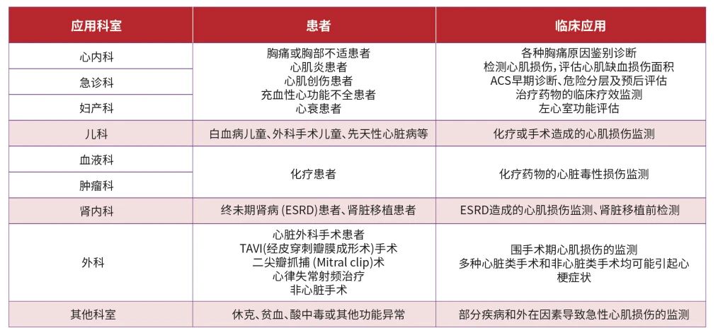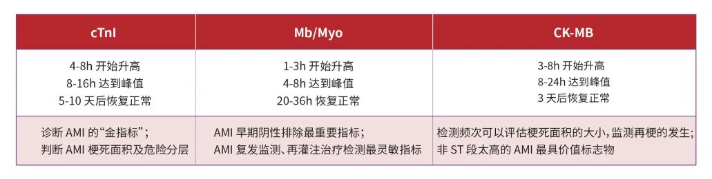 心脏细胞胞质中含量富厚,具有高度心脏特异性,AMI爆发后20min最先升高,1~3h内可以在血中检测出,4~6h抵达峰值,20~30h内血浆中的浓度恢复正常水平,其释放量与心肌损伤规模成正比。