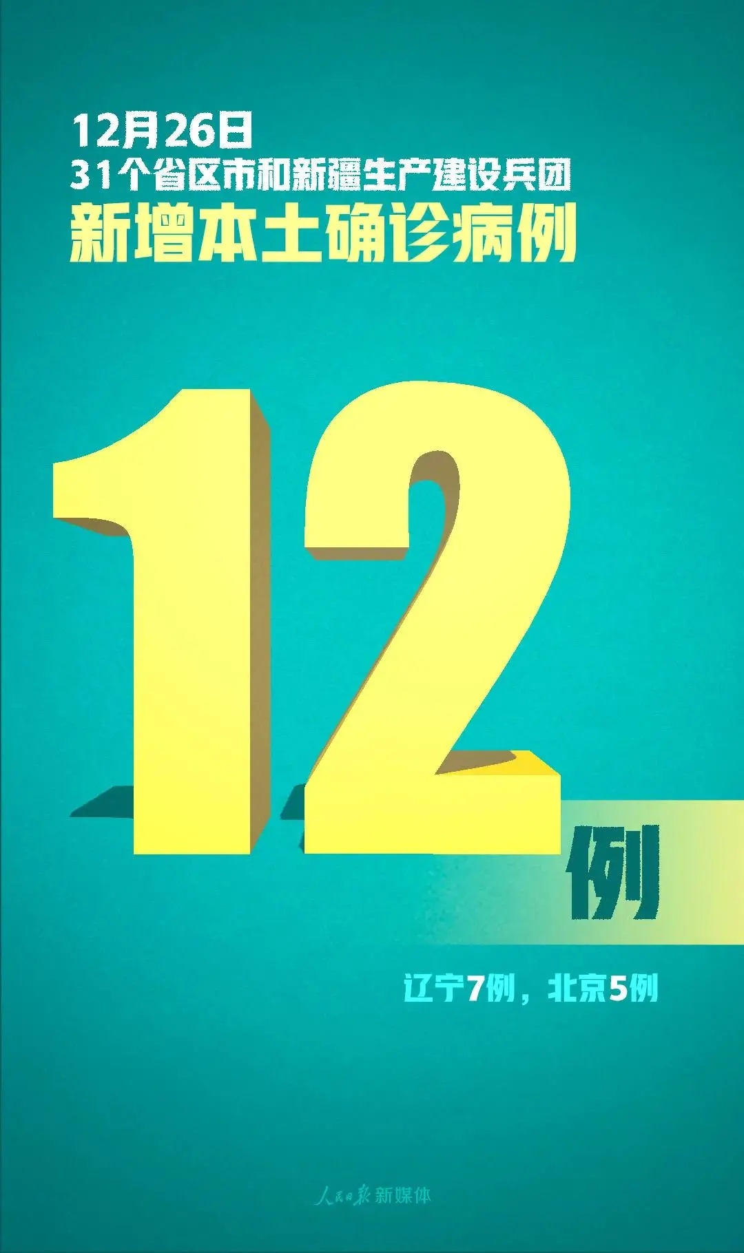 12ÔÂ26ÈÕ0¡ª24ʱ£¬31¸öÊ¡£¨×ÔÖÎÇø¡¢Ö±Ï½ÊУ©ºÍн®Éú²ú½¨Éè±øÍű¨¸æÐÂÔöÈ·ÕﲡÀý22Àý£¬ÆäÖо³ÍâÊäÈ벡Àý10Àý£¨ÉϺ£4Àý£¬±±¾©3Àý£¬Õã½2Àý£¬°²»Õ1Àý£©£¬±¾ÍÁ²¡Àý12Àý£¨ÁÉÄþ7Àý£¬±±¾©5Àý£©£»ÎÞÐÂÔöéæÃü²¡Àý£»ÎÞÐÂÔöÒÉËÆ²¡Àý¡£