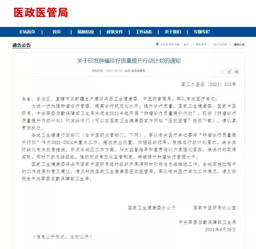 10月15日 ,国家卫健委宣布《关于印发肿瘤诊疗质量提升行动妄想的通知》 ,进一步提升肿瘤诊疗质量水平 ,规范诊疗行为 ,包管医疗质量清静。