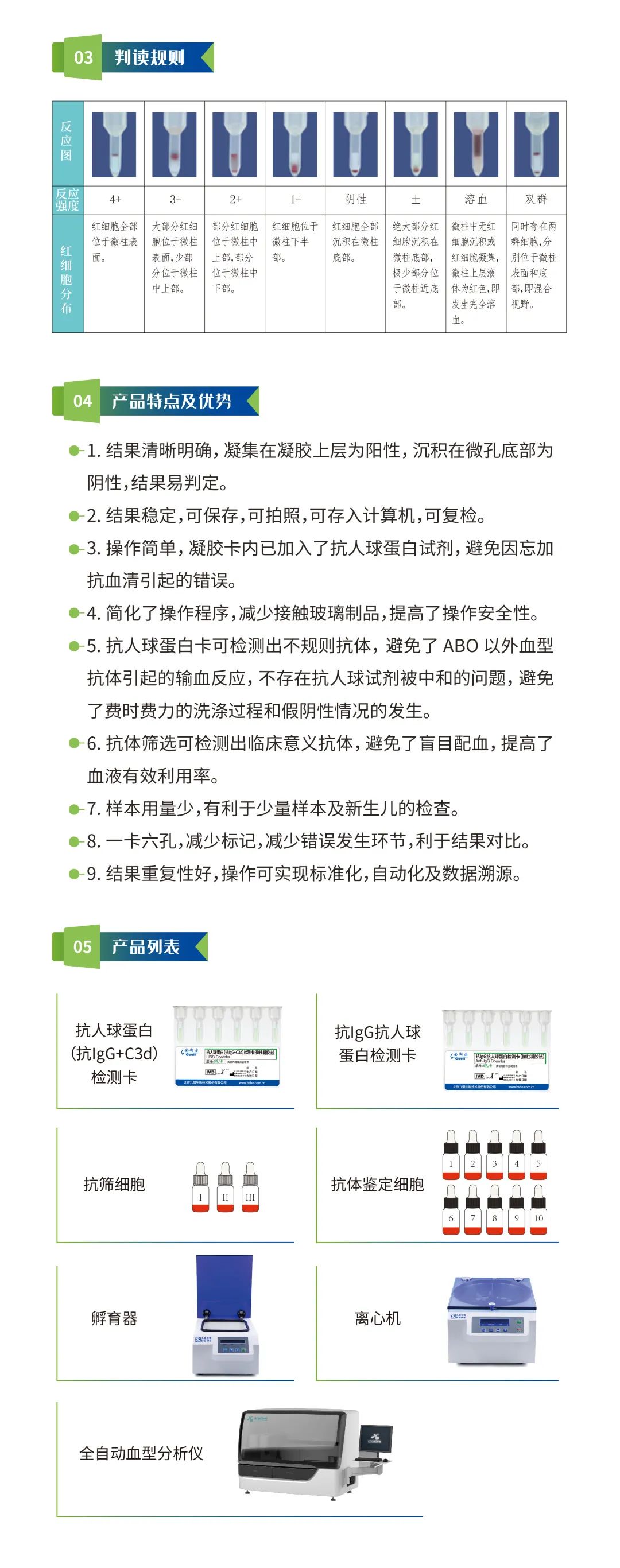 本试剂盒用于间接抗人球卵白试验,用于不规则抗体筛查和交织配血,仅用于临床检测,不必于血源筛查。
