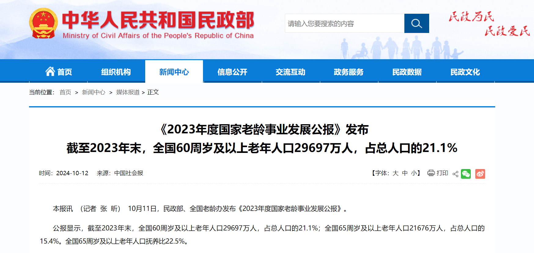 ÃñÕþ²¿¡¢ÌìÏÂÀÏÁä°ì11ÈÕÐû²¼¡¶2023Äê¶È¹ú¼ÒÀÏÁäÊÂÒµÉú³¤¹«±¨¡·¡£¹«±¨ÏÔʾ£¬×èÖ¹2023Äê⣬ÌìÏÂ60ÖÜËê¼°ÒÔÉÏÍíÄêÉú³Ý29697ÍòÈË£¬Õ¼×ÜÉú³ÝµÄ21.1%¡£ÌìÏÂ65ÖÜËê¼°ÒÔÉÏÍíÄêÉú³Ý21676ÍòÈË£¬Õ¼×ÜÉú³ÝµÄ15.4%¡£ÌìÏÂ65ÖÜËê¼°ÒÔÉÏÍíÄêÉú³Ý¸§Óý±ÈΪ22.5%¡£