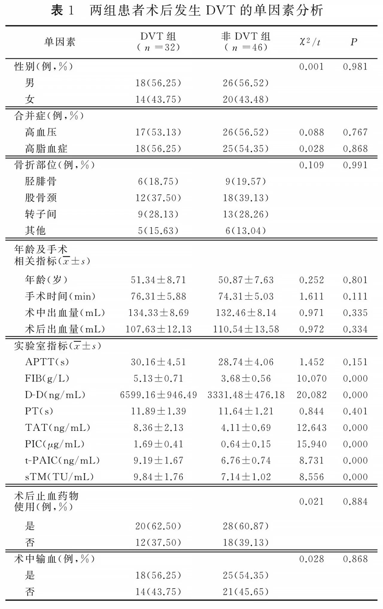 Á½×黼ÕßÐÔ±ð¡¢ÄêËê¡¢ºÏ²¢Ö¢¡¢¹ÇÕÛ²¿Î»¡¢ÊÖÊõʱ¼ä¡¢ÊõÖгöѪÁ¿¡¢Êõºó³öѪÁ¿¡¢APTT¡¢PT¡¢ÊõºóֹѪҩÎïʹÓá¢ÊõÖÐÊäѪ½ÏÁ¿£¬²î±ðÎÞͳ¼ÆÑ§ÒâÒå(P>0.05)£¬DVT×éFIB¡¢D-D¡¢TAT ¡¢PIC¡¢t-PAIC¡¢sTM ÏÔÖø¸ßÓÚ·Ç DVT×飬²î±ðÓÐͳ¼ÆÑ§ÒâÒå(P<0.05)£¬¼û±í1¡£