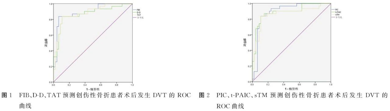 ΪÃ÷È·´´ÉËÐÔ¹ÇÕÛ»¼ÕßÊõºó±¬·¢DVTµÄΣÏÕÒòËØ£¬±ÊÕßÐÐROC¼°Logistic»Ø¹éÆÊÎö£¬Ö¤ÊµFIB>4.766 g/L¡¢D-¶þ¾ÛÌå>4833.945 ng/mL¡¢TAT>6.077 ng/mL¡¢PIC>1.089 ¦Ìg/mL¡¢t-PAIC>7.754 ng/mL¡¢sTM>8.552 TU/mlÊÇ´´ÉËÐÔ¹ÇÕÛ»¼ÕßÊõºó±¬·¢DVTµÄΣÏÕÒòËØ£¬ÌáÐÑÔÚ¶Ô´´ÉËÐÔ¹ÇÕÛ»¼ÕßÊõºóDVTΣº¦¾ÙÐÐÕ¹Íûʱ£¬Ó¦¶ÔÆäÄýѪָ±ê¼°ÑªË¨·Ö×Ó±ê¼ÇÎïˮƽÇ×½ü¼à²â£¬ÒÔÔ¤·ÀÊõºóDVTµÄ±¬·¢¡£