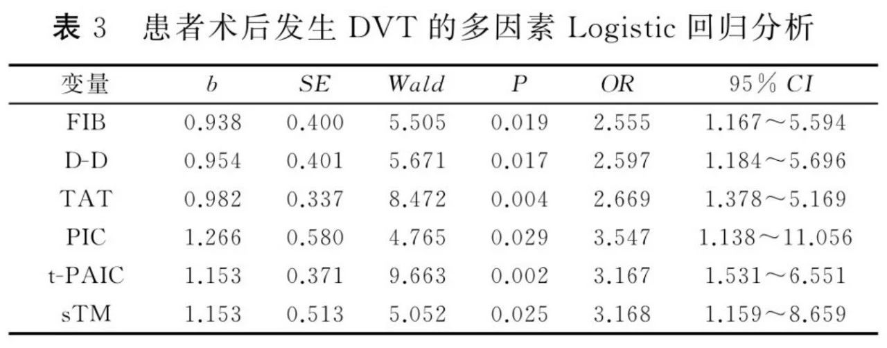 Logistic »Ø¹éÆÊÎöÏÔʾ£ºFIB>4.766g/L¡¢D-D>4833.945 ng/mL¡¢TAT>6.077 ng/ml¡¢PIC>1.089 ¦Ìg/mL¡¢t-PAIC>7.754 ng/mL¡¢sTM¡Ý8.552TU/mÊÇ´´ÉËÐÔ¹ÇÕÛ»¼ÕßÊõºó±¬·¢DVTµÄΣÏÕÒòËØ(P<0.05)£¬¼û±í3¡£